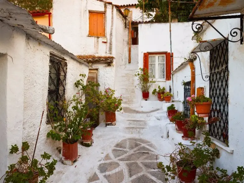 Es bueno saberlo: hermosas casas pintadas en colores pastel adornadas con buganvillas se alinean en las calles, y escondidas en rincones tranquilos se encuentran iglesias históricas, incluida la Iglesia Metamórfosis y la Iglesia de Kapnikaréa.