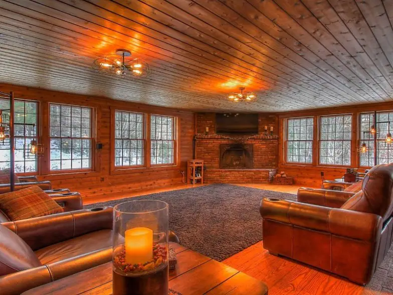 Esta cabaña de troncos única construida con árboles canadienses de más de 200 años ofrece la mejor experiencia de Vermont en cinco acres privados. La casa de tres pisos tiene un lujoso interior con cinco habitaciones con capacidad para 14 personas, una chimenea y una gran sala con un techo de 30 pies. Hay una cocina gourmet equipada con todos los electrodomésticos que puedas necesitar y una sala de proyección tipo cueva con una barra de 10 pies, mesa de billar, mesa de air hockey, futbolín y un proyector con pantalla para ver películas desde los asientos del cine. Al aire libre hay una terraza con otro bar, una parrilla, mesas y sillas para cenar al aire libre también.