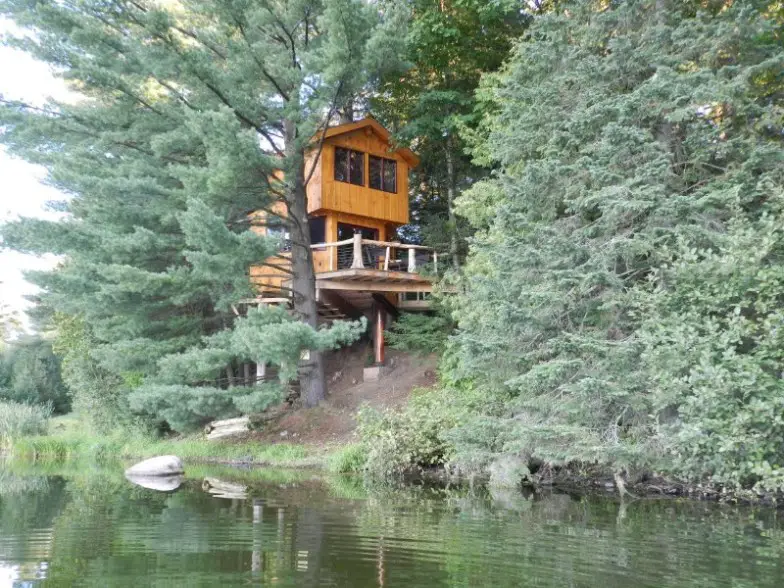 Esta hermosa cabaña en el árbol ofrece una estadía fabulosa rodeada de naturaleza en 40 acres con bosque y humedales, ubicada al borde de un estanque. Con muchos vidrios y ventanas, disfrutará de vistas especialmente serenas, pero probablemente también quiera salir y jugar: Jay Peak Ski Resort está a poco más de 20 minutos, y la casa del árbol también cuenta con una canoa para remar. como un jacuzzi de cedro para relajarse.
