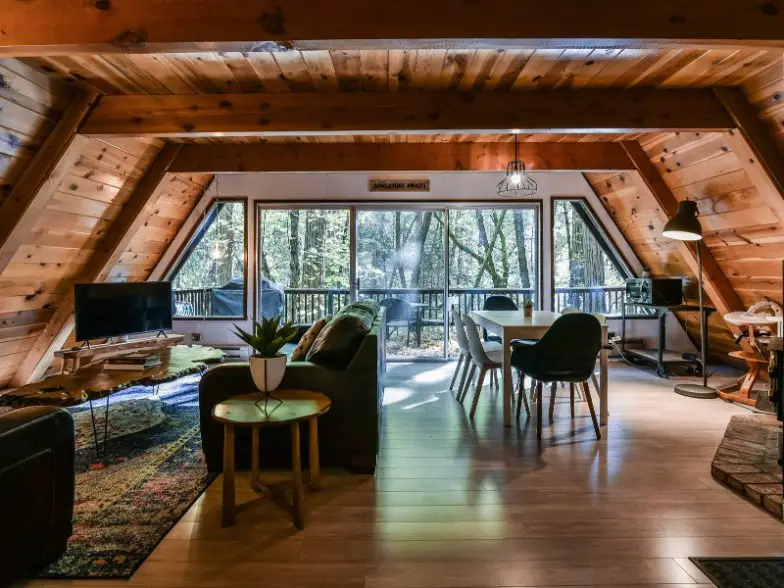 Una capa de hojas doradas cubre el porche durante el otoño, paredes de madera cálidas y acogedoras se inclinan hacia el espacio, y un ambiente acogedor en general es casi tangible. Los invitados notan que la cabaña está bien escondida dentro del bosque, y también es relativamente amigable para los niños, con atributos como una puerta para evitar que los pequeños caigan por las escaleras del porche. Twain Harte está a solo una hora y media de Yosemite y ofrece su propio conjunto de emocionantes atracciones.