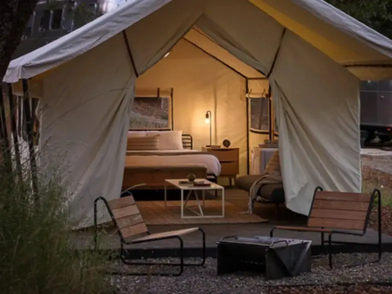 La marca AutoCamp tiene ubicaciones entre algunos de los destinos más soñados de los EE. UU., y Yosemite es uno de ellos. Los viajeros pueden optar por alojarse en una suite de lujo, un remolque airstream o una tienda de lona hecha a medida. Las tiendas de campaña están diseñadas para tener todo el lujo que ofrecería una habitación de hotel y, al mismo tiempo, estar bien conectadas con el glorioso entorno al aire libre de este notable parque nacional. El interior resplandece con una luz cálida y acogedora, que llamará tu nombre a un colchón de espuma viscoelástica después de una noche asando malvaviscos junto al fuego.