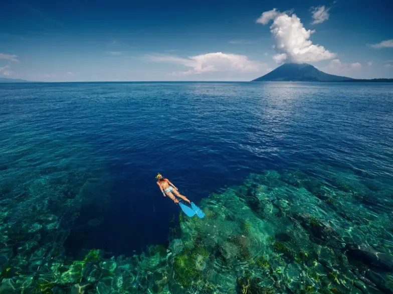 Las Islas Bunaken en Indonesia albergan el Parque Nacional Marino de la Isla Bunaken, que incluye cinco islas pequeñas que se consideran puntos de acceso para los entusiastas del esnórquel. Sus hermosas formaciones de coral están vivas con cientos de especies de peces llenas de vida marina. Hay un arrecife de una milla de largo que bordea la costa sureste de la isla, donde puedes ponerte una máscara y aletas y explorar el bosque multicolor de peces, desde peces mariposa hasta peces trompeta, enormes peces puercoespín y tortugas marinas. El pez ángel es la especie más colorida que se encuentra aquí, una criatura fotogénica que se ve a menudo en los arrecifes.
