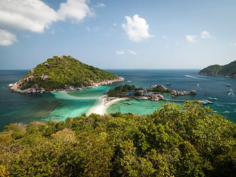 Un conjunto de tres islas conectadas por dos franjas de arena de coral blanco, Koh Nang Yuan en Tailandia presenta una playa que se revela durante la marea baja y desaparece bajo el agua clara cuando sube. Salpicado por tres lagunas llenas de azul que viene en una variedad de tonos, perfecto para un día tranquilo de esnórquel bajo el sol. Sus paisajes de postal están bordeados por rocas de granito donde descubrirás peces payaso en sus anémonas, peces mariposa, almejas y cardúmenes de peces loro.