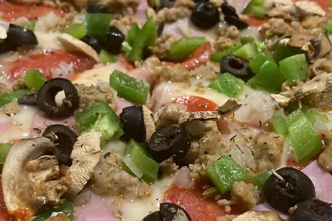 La Reuben Pizza es una auténtica delicia. Esos exquisitos trozos de jamón sobre esa deliciosa masa seguro que saciarán tus antojos de carne. Ese queso increíble por toda la masa le da ese sabor cremoso final que hace que tu experiencia gastronómica sea completa.
