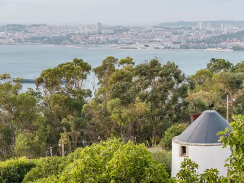 Molino de viento de la década de 1850 con vistas a la ciudad y al río - Setúbal, Portugal