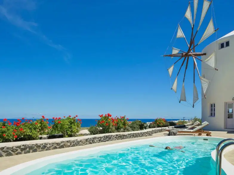 Santorini Windmill Villas adopta un enfoque diferente, con molinos de viento de nueva construcción que componen un pequeño complejo con vistas al mar Egeo. En lugar de una experiencia rústica, los huéspedes se sumergen en el lujo en toda regla mientras se hospedan en sus elegantes alojamientos o mientras descansan junto a su propia piscina y jacuzzi prístinos. Cada villa también está equipada con sus propios jardines separados. Todo lo que amamos de la experiencia del molino de viento, además de enriquecer la historia, se ha mejorado en este asombroso resort. En cada una de ellas pueden alojarse cómodamente hasta cinco personas.