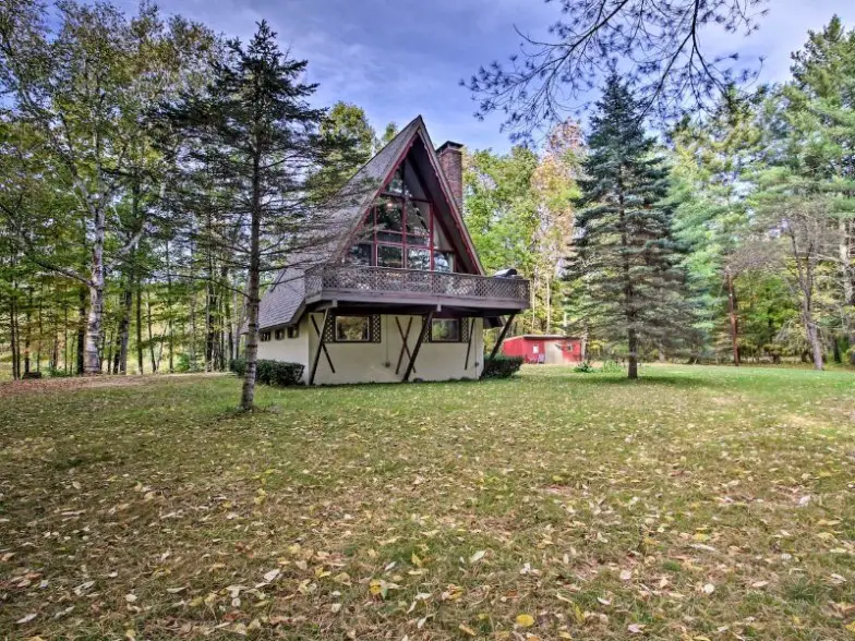 Hay algo súper encantador en un marco en A en el bosque. Las encimeras rojas y los ladrillos encalados a la vista en la cocina de alguna manera mantienen el tema con los colores cambiantes del otoño. En el exterior, encontrarás un paraíso infinito de paisajes y vida salvaje. Y hay un centro turístico importante cerca. Sin embargo, podrías quedarte completamente aislado en la encantadora vivienda.