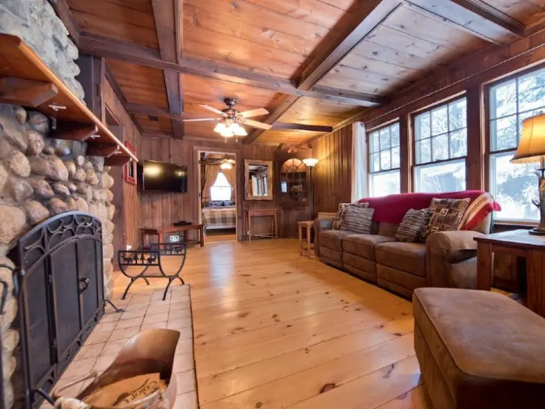 Esta enorme cabaña relativamente nueva puede alojar cómodamente hasta nueve personas. Hay un montón de pequeños rincones muy bonitos integrados en el espacio, y todo tiene un toque un poco naturalista, como una barandilla viva. Cerca hay ríos para la recreación y, por supuesto, la belleza de las Montañas Blancas. ¿Qué podemos decir? Uno de los lugares más buscados para experimentar el otoño en New Hampshire en las Montañas Blancas.