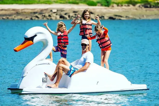 Lleve a sus niñas y niños pequeños en un bote de pedales Swan y navegue por el agua para una experiencia familiar divertida.