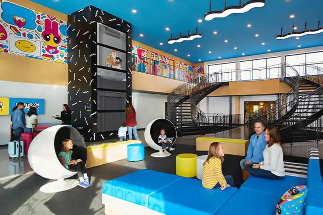 El hotel también ofrece juegos y experiencias interactivos, un espacio de juegos, una piscina al aire libre estilo centro turístico y una pantalla de cine al aire libre, todo con el tema de Cartoon Network, lo que le garantiza una de las mejores vacaciones familiares en Pensilvania .
