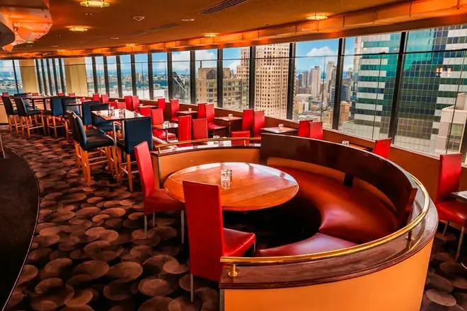 The View es un restaurante giratorio en el piso 48 del hotel Marriott Marquiss .