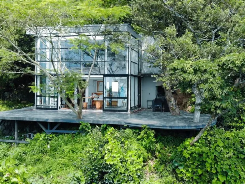 Esta villa modernista de un dormitorio con fachada de vidrio junto a un acantilado se encuentra dentro de un parque nacional costero en el extremo sur de la península de Izu en Tokio, Japón. Disfrutará de privacidad total en este lugar asombrosamente aislado que ofrece vistas al mar de 200 grados y oportunidades para observar la vida silvestre como aves rapaces, ciervos, jabalíes y monos japoneses. La casa y la terraza se diseñaron para maximizar las vistas abiertas del Pacífico y brindar lo mejor que encontrará en Izu, y posiblemente uno de los mejores del mundo.