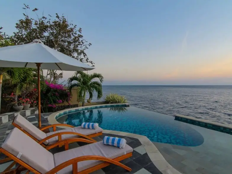 Ubicada en el este de Bali, Villa Aquamarine cuenta con una piscina infinita con vista al Océano Índico donde pasan delfines, tortugas marinas y ocasionalmente ballenas. Puede esperar relajarse en la terraza, saltar al mar y bucear justo en frente de la villa. Incluso puede disfrutar de un festín con comidas balinesas tradicionales preparadas por el ama de llaves/cocinero. La casa tiene capacidad para seis personas en dos habitaciones e incluye televisión por cable y un reproductor de DVD, un altavoz Bose Sound Dock y Wi-Fi gratis.