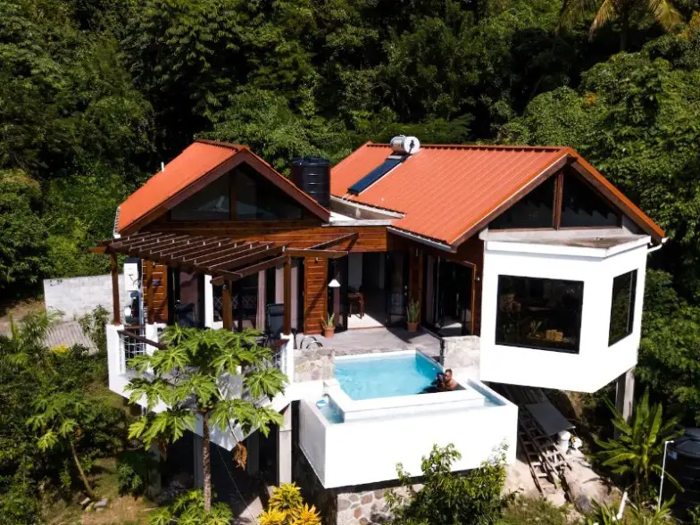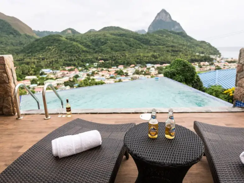Esta impresionante villa de dos dormitorios tiene capacidad para cuatro personas y ofrece total privacidad, ya que tendrás todo el lugar para ti. Cuenta con un diseño abierto, vistas panorámicas al mar y una amplia gama de comodidades modernas, mientras que se encuentra a poco más de 10 minutos en automóvil del único volcán del mundo con acceso para vehículos, a menos de cinco minutos de la histórica Soufriere. Ambos dormitorios tienen baño privado con duchas de lluvia e incluyen SmartTV de 55″ y balcones privados con vista al Caribe y las montañas Piton. Lo más destacado puede ser la piscina infinita con vista a los Pitons, aunque también tendrá una cocina totalmente equipada, Wi-Fi gratis y una computadora, Netflix gratis y una lavadora/secadora.