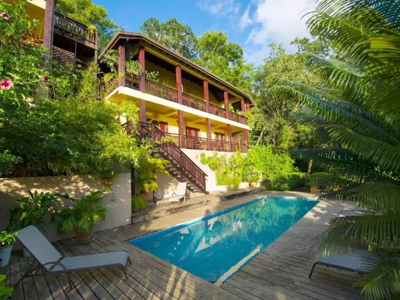 Esta magnífica villa de tres dormitorios, construida en estilo tradicional caribeño, tiene capacidad para siete en la exclusiva zona de Anse Chastanet/Jade Mountain de Soufriere. Puede esperar total privacidad y serenidad, rodeado de exuberantes jardines tropicales mientras ofrece impresionantes vistas del Caribe y Pitons. Se encuentra a 300 pies sobre el mar, frente a los Pitons, y disfruta de la brisa fresca de la isla. Cada dormitorio tiene su propio patio, con el principal con vistas al mar y los otros dos con vistas a los jardines. Por una tarifa nominal, también se pueden organizar cenas caribeñas con el cocinero de la casa. La villa cuenta con personal completo con dos amas de casa, un jardinero, un encargado de la piscina y seguridad nocturna, todo incluido en las tarifas.