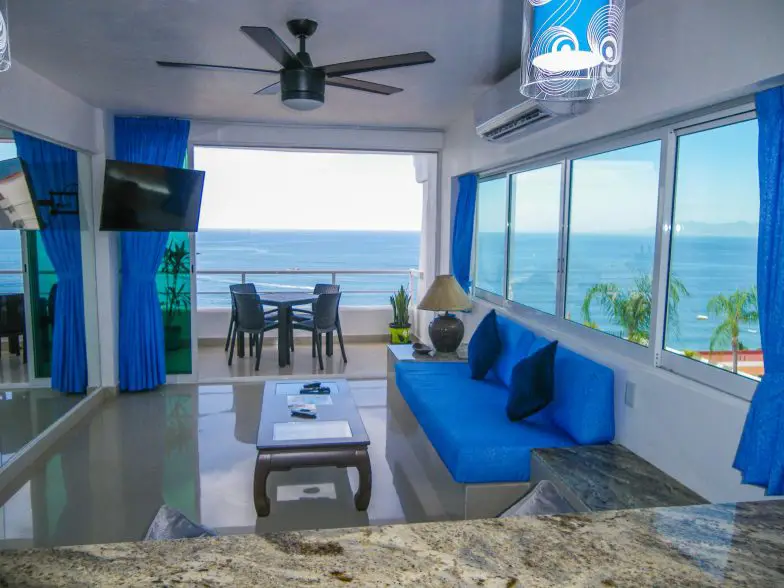 La decoración azul y blanca de este Airbnb de Puerto Vallarta garantiza que siempre te sentirás relajado y relajado durante tu estadía aquí, y eso es incluso antes de que hayas echado un vistazo por los grandes ventanales y hayas visto el océano debajo. Un lugar donde reinan las vistas, este apartamento de una habitación es el más adecuado para una pareja, con una cómoda cama tamaño king y una acogedora sala de estar. Si alquila este lugar como un grupo más grande, hay una cama adicional en la sala de estar que puede acomodar hasta dos personas más. Las vistas al mar y a la ciudad van de la mano durante su estadía aquí, ya que está perfectamente ubicado para actividades tanto en la playa como en la ciudad. Una gran selección de restaurantes y una animada vida nocturna te esperan a solo unos pasos del apartamento si no te apetece cocinar una noche.