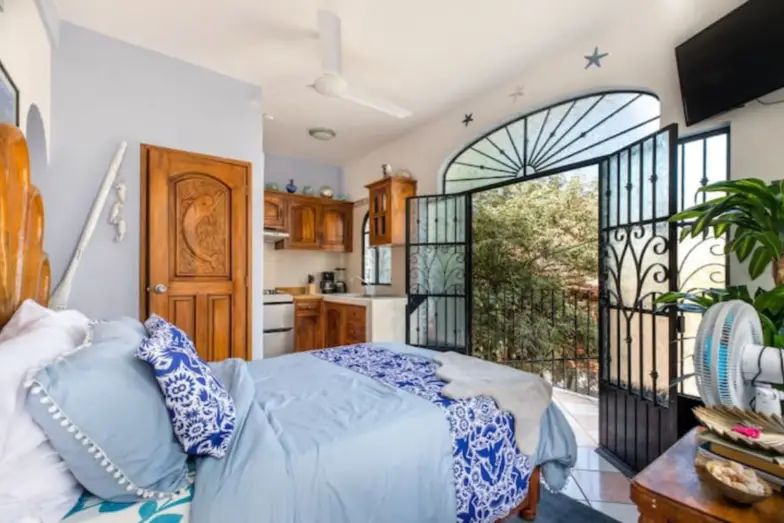 Lo primero que verá cuando se despierte en este Airbnb es la hermosa catedral, que se encuentra justo afuera del bloque de apartamentos y ofrece un telón de fondo brillante para su café de la mañana. Este Airbnb de una habitación realmente no podría estar mejor ubicado, con el océano a un lado y la ciudad al otro. Con espacio para dos personas, es una escapada brillante y económica en Puerto Vallarta que definitivamente funciona como base de operaciones durante al menos unos días en la ciudad. La terraza del último piso aquí es una de las mejores características de este Airbnb, con vistas panorámicas de Puerto Vallarta y toda su magia. El dormitorio aquí también es bastante especial, con enormes ventanales que se abren a la naturaleza y al aire libre: incluso si normalmente duermes con las cortinas cerradas, podrías reconsiderarlo aquí.