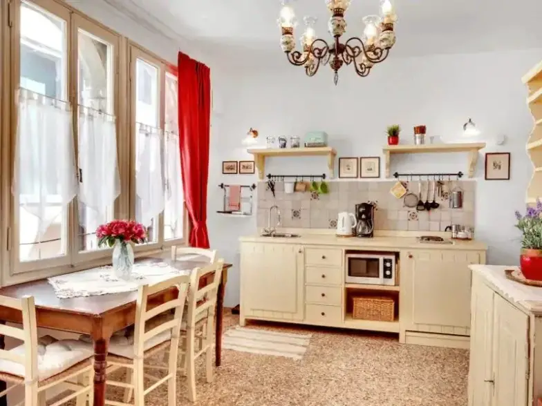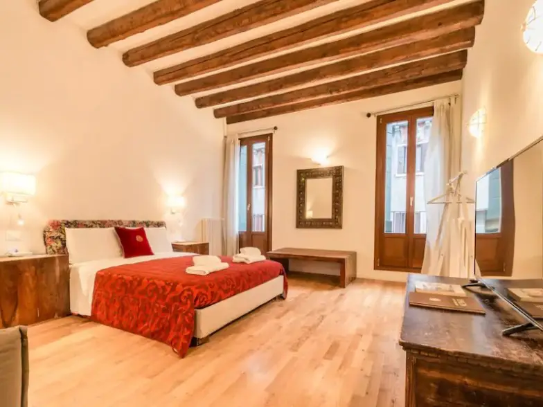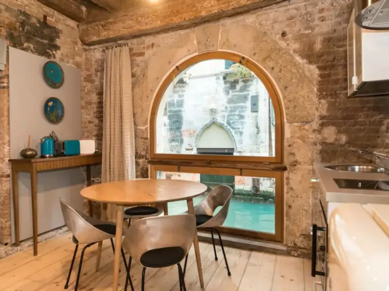 Con un dormitorio y un baño, este apartamento en alquiler en Airbnb es otra de las mejores opciones en Venecia. Es un apartamento de estilo veneciano con ventanas que dan a la plaza Frari y que está bien equipado con cocina, wifi, lavandería y baño. Está en el centro de Venecia y cerca de trenes y autobuses. Los viajeros solos, las parejas, los viajeros de negocios, las familias con niños y los turistas con mascotas pueden quedarse aquí. Hay dos camas individuales en el dormitorio y una pequeña cama doble en el área común para dormir.