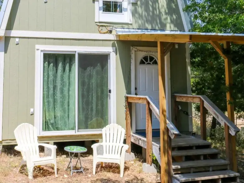 La cabaña Dream Away está disponible para alquilar en Vrbo y tiene un tamaño de 1,250 pies cuadrados. Tiene capacidad para seis personas y tiene dos dormitorios, tres camas y dos baños. Esta cabaña se encuentra en una propiedad privada de tres acres y a solo unos minutos a pie del lago Canyon. Cuenta con un gran porche delantero, una hamaca doble a la sombra, un jacuzzi, una fogata al aire libre y oportunidades para observar la vida silvestre. Wi-Fi de alta velocidad y un televisor de alta definición están disponibles para uso de los huéspedes. La ubicación apartada también es perfecta para observar las estrellas en una noche despejada.