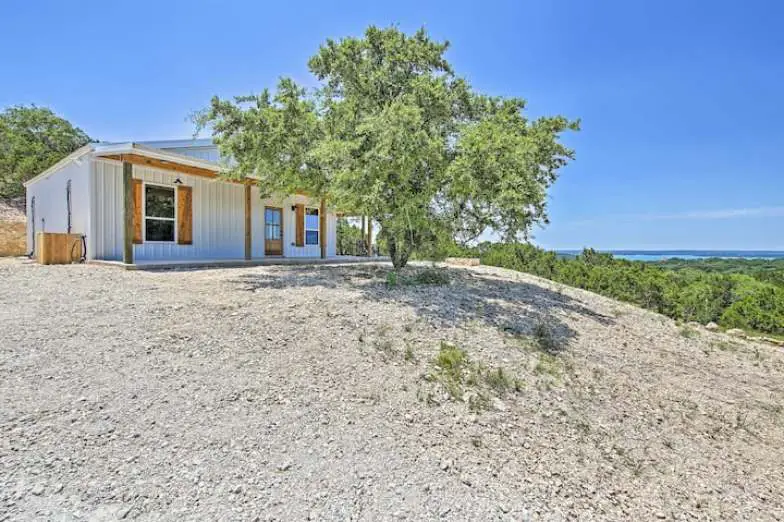 Disponible para alquilar en Vrbo, esta cabaña tiene capacidad para seis u ocho personas en Canyon Lake y tiene un dormitorio, tres camas y un baño. Está en cinco acres de tierra en el rancho de un pequeño caballero con pollos, pavos, pájaros y ciervos. Los propietarios viven en el lugar en caso de que necesite algo. Es una cabaña sin mascotas, apta para sillas de ruedas y con una cocina moderna. Los arreglos para dormir son una cama tamaño king, una cama tamaño queen, un futón tamaño queen y un futón tamaño completo. El estacionamiento está disponible aquí para un bote si trae uno. Las rampas para botes en el lado norte del lago Canyon se encuentran cerca. Las comodidades modernas incluyen Wi-Fi, Smart TV y puertos USB. El patio aquí también es ideal para disfrutar de un café o un vino.