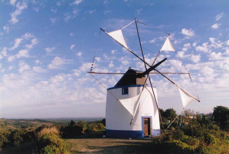 A un kilómetro de Miróbriga se encuentra uno de los muchos molinos de viento encalados del campo cerca de Santo André.