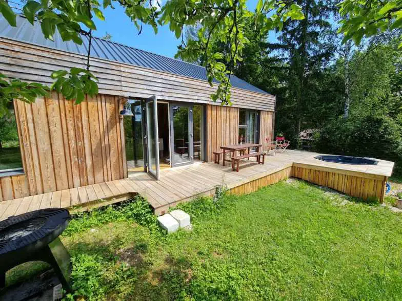 Pareciendo un sueño, esta casa de tres habitaciones está rodeada de prados llenos de flores silvestres y montañas boscosas, y ofrece fácil acceso a caminatas, ciclismo, natación y piragüismo durante los meses más cálidos, y el invierno brinda oportunidades para el esquí alpino y de fondo. Hay un jardín y una parrilla de barbacoa para comidas al aire libre, así como una cocina completa con todos los electrodomésticos necesarios, incluida una cafetera, lavavajillas y microondas. En el área abierta de la sala de estar / comedor, tendrá una mesa de comedor, TV vía satélite con reproductor de DVD y una estufa de pellets. Tiene capacidad para seis, ideal para familias con equipamiento como trona y cama para niños incluidos también.