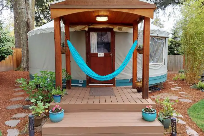 Cuando estés en Portland, una forma única de hospedarte en la ciudad es alquilar una yurta de Airbnb, como esta. Tiene capacidad para cinco personas y está situado en un vecindario seguro del suroeste de Portland en un 1/3 de acre. Está a seis millas del centro de la ciudad y tiene un sendero para caminatas y ciclismo a una cuadra de distancia. La yurta tiene una cocina, pero el baño está en el cuarto de servicio de la casa que está a pocos pasos de la yurta. Tiene 24 pies de diámetro y tiene un porche cubierto con una hamaca. El patio trasero también está equipado con un trampolín, un columpio de árbol y una casa de juegos para niños. El anfitrión proporciona muchos artículos esenciales en el interior, como toallas, café, té, artículos de tocador y secador de pelo. No se permiten mascotas aquí.