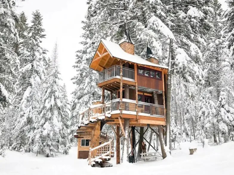Este Airbnb único e impresionante ha aparecido en HGTV, DIY Network, en Time and Outside Magazine . Y no es de extrañar, sería difícil imaginar una fantasía invernal más perfecta. Las casas en los árboles de dos pisos se asientan en cinco acres arbolados a solo minutos de Whitefish Mountain Ski Resort y a media hora en automóvil del Parque Nacional Glacier, cerca de las comodidades en Columbia Falls y Whitefish. Si bien puede acomodar hasta cuatro, es ideal para una escapada romántica. Tiene una escalera de caracol hecha a medida alrededor de un abeto Douglas gigante con 500 pies cuadrados de espacio habitable, dos áreas de terraza exterior, una a la que se accede desde la suite principal, una cocina completa, Wi-Fi y TV.