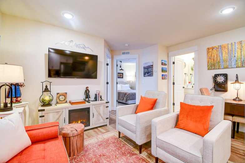 Ubicado en una casa victoriana remodelada en el centro de West 7th Street, este apartamento de dos habitaciones tiene capacidad para cuatro huéspedes y tiene vista a las montañas Sawatch, con una ventana panorámica de Mt. Elbert y Mt. Massive. Tiene una sala de estar extra espaciosa de concepto abierto con un escritorio convertible para trabajar de pie o sentado que incluye dos monitores de 24″, un Smart TV, una chimenea de gas y una mesa tipo bistró donde puede disfrutar de su bebida favorita mientras disfruta de la vista a la montaña. . La cocina ofrece todo lo que necesita para preparar sus propias comidas y si se hospeda en el invierno para aprovechar la oportunidad de esquiar en el cercano Ski Cooper, apreciará la entrada que incluye un portaesquís y un secador de botas.