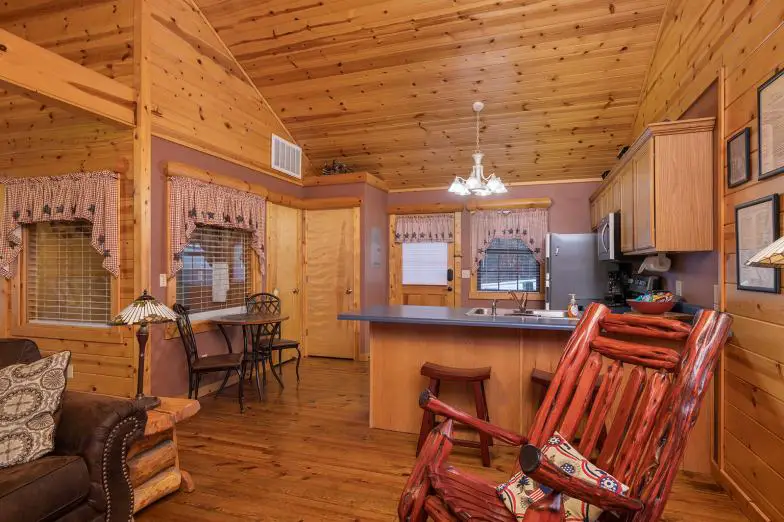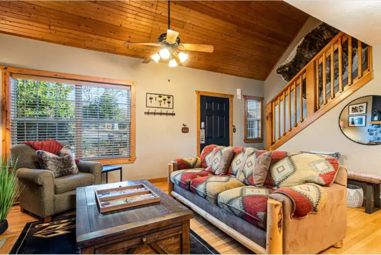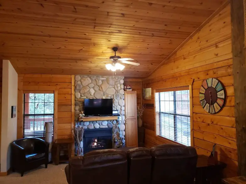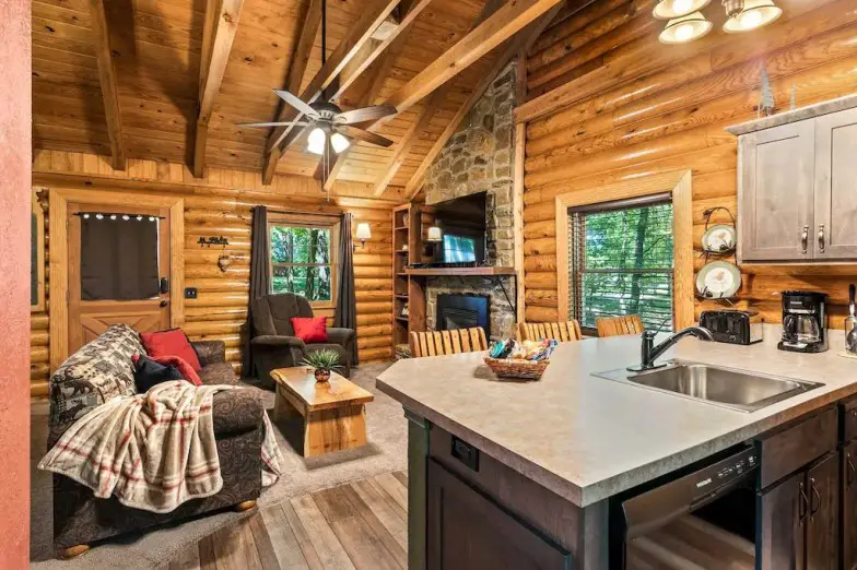 En la misma propiedad que una de nuestras otras selecciones de cabañas, los huéspedes encontrarán un plano de planta ligeramente diferente que es igual de romántico. Por supuesto, tendrá acceso a todas las maravillosas instalaciones, como el campo de golf, la cancha de baloncesto y el pintoresco paisaje. La chimenea de piedra de este alquiler está definitivamente al frente y en el centro, y probablemente será el punto focal de numerosas cenas relajantes.