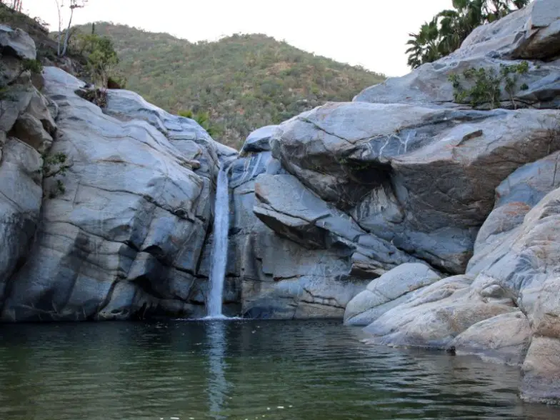 Cascada Sol De Mayo ofrece un oasis en el desierto, ubicado en la base de las montañas de Sierra Laguna. Si bien se siente como si estuviera a un mundo de distancia de las multitudes de fiestas en Cabo, está a solo una hora en automóvil al norte del aeropuerto, lo que brinda una alternativa fabulosa y tranquila para nadar. Los visitantes pueden saltar 25 pies hacia la piscina tranquila donde fluye una cascada haciendo una caminata corta por un sendero bien marcado. Si bien hay visitas guiadas disponibles, se puede llegar fácilmente de forma independiente a través de la autopista 1: tome el desvío a Santiago y observe los carteles de Sol de Mayo y Cascadas.