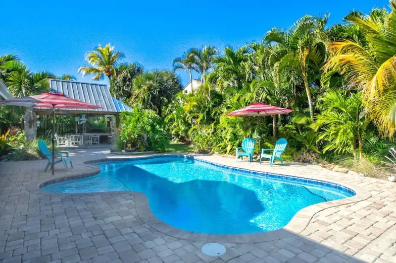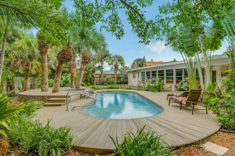 A solo unos pasos de la playa, este hermoso alquiler de vacaciones de cuatro habitaciones en Melbourne Beach es un refugio de lujo. Además del acceso a la playa privada a solo un minuto a pie, puede aprovechar el área al aire libre de la casa con una piscina espectacular, una cabaña tiki y una parrilla para barbacoa. Además de un interior espacioso que puede acomodar hasta 10 invitados, tiene una ubicación privilegiada en Melbourne Beach, a poca distancia del muelle de Melbourne Beach. Los restaurantes y pubs están a seis cuadras en Ocean Avenue, mientras que los campos de golf también están disponibles en las cercanías.