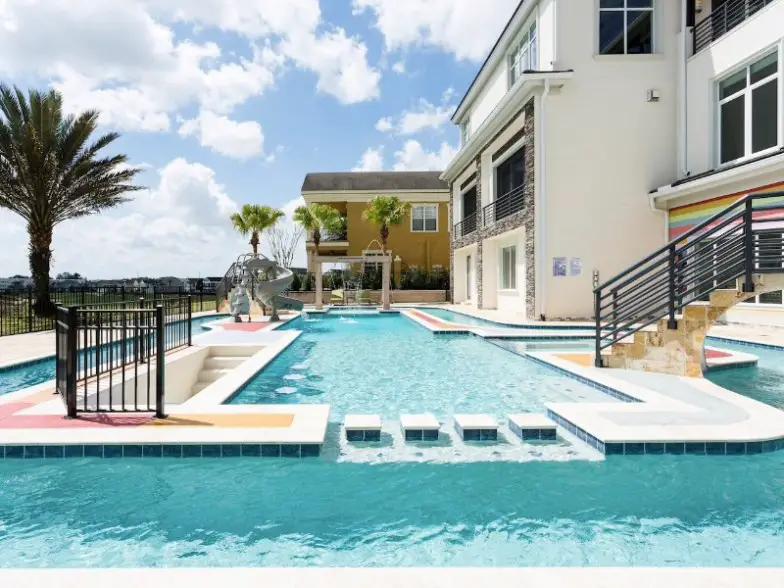 If you are really looking to splurge with your large group, book this house for up to 16 guests and that has 14 bedrooms and 16 baths. Not only does it have a rooftop pool but also a private lazy river and a spa! The mansion has over 25,000 square feet of upscale space and also has a bowling alley with two lands, a private basketball court, conference room, games room, two-tier cinema, and spa room. You’ll also feel like royalty here with the private gym, arcade, sunken bar with stools at the pool, and multiple kitchens. A stay here also includes access to Reunion Resort amenities, like the water park and golf.