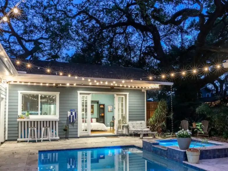 Two guests can also stay in this top-rated Airbnb in Jacksonville, which has one bedroom and one bath. It has a professionally designed pool that’s private and very relaxing. The property is close to downtown Jacksonville, as well as the Florida Theater, TIAA Bank Field, and Daily’s Place Amphitheater. The cottage is a 400-square-foot-space that is quiet and beautifully designed. Guests access the cottage through a side garden gate and have free parking along the road. Wi-Fi can be spotty here, and TV is accessible through a digital antenna.
