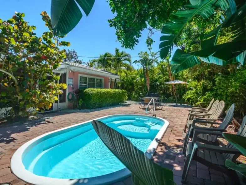 Also, in the Miami area is this guesthouse with a pool for up to two people. It is a studio space near Brickell and Little Havana. There is a kitchen, free parking, Netflix, and Apple TV on site too. From here, you can get to South Beach in about 15 minutes and bike over to Key Biscayne and Coconut Grove. This pool is shared with the main house but the house itself is private with its own garden seating.