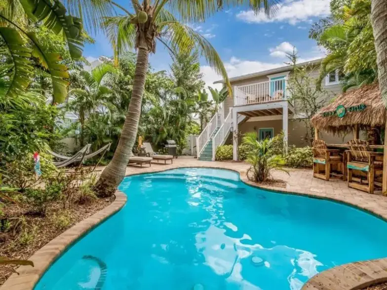You can also choose this vacation rental with a private pool when you spend time in the Clearwater Beach area. It’s just 30 seconds from the sand and sleeps up to 12 guests. Other features are a full kitchen, a spacious living room, and a beautiful backyard where the pool is located. It’s in the Caroluel subdivision and near Pier 60 and the Jolley Trolley stops. For an extra fee, you can have the pool heated here. Pets may be considered for an extra fee as well.