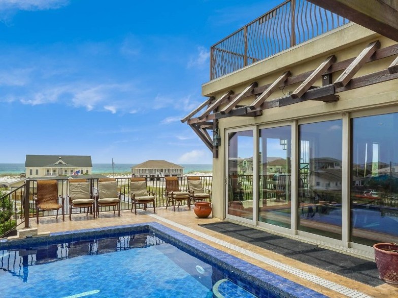 A good option with a pool in Pensacola Beach is this house that has four bedrooms and five baths. The custom-built pool here has a fountain, outdoor bar, outdoor bathroom, large sectional, and views of the gulf and island. The kitchen, dining, and living areas are “open concept” and open up to the pool and decks. It’s a relaxing space with 1,400 square feet of decks, an incredible kitchen, and a location in the heart of Pensacola Beach. There is an additional sleeping space here for your large group of up to 16 people.