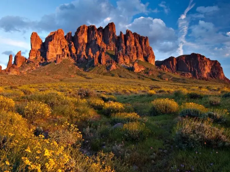 The Superstition Mountains lie just 40 minutes east Phoenix, jam-packed with miles of gorgeous trails and unique geological features. One of the top hikes here is the approximately 2.4-mile Treasure Loop Trail, which takes around two hours to hike, accessed from Lost Dutchman’s State Park which sits at an elevation of 2000 feet. It will bring you through and past interesting rock formations, with benches along the way if you need a rest. Spring is an ideal time to hike to enjoy it with wildflowers like lupine, poppies, globemallow and other colorful varieties in bloom.