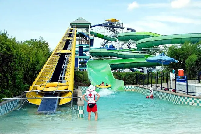 Esta joya de parque acuático cuenta con excelentes toboganes, un río lento, comida deliciosa y un área de juegos Rainforest para los más pequeños.