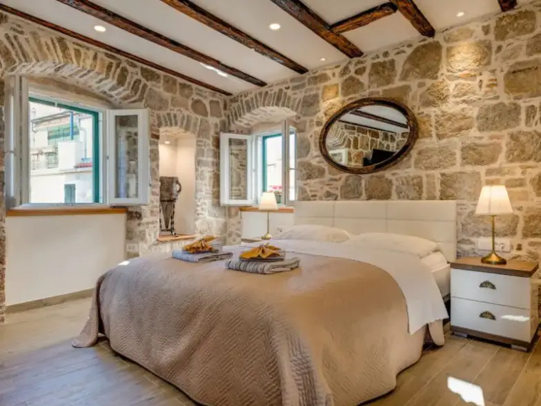 Este estudio para dos en el centro del casco antiguo cuenta con su propio patio tranquilo para relajarse y ofrece la oportunidad de ponerse en la piel de la realeza que una vez caminó por los mismos escalones del siglo IV hechos de piedra importada de la cercana isla de Brac. Tiene aire acondicionado e incluye una cama tamaño queen, televisión por cable, Wi-Fi y una mesa de bistró flanqueada por ventanas con cerrojo y largas cortinas blancas, ideal para observar a la gente mientras se toma un poco del sabroso vino local.