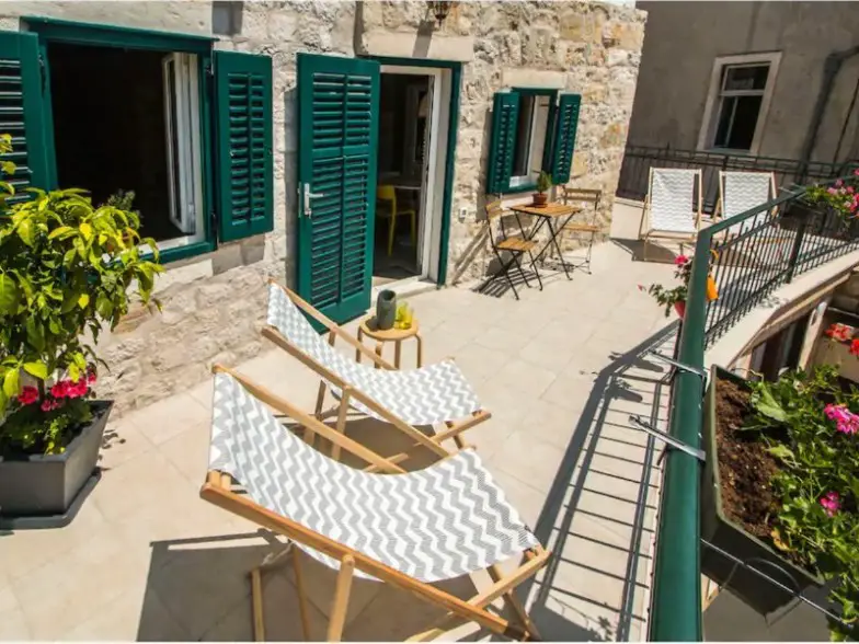 Este dúplex de un dormitorio tiene capacidad para cinco personas en cuatro camas, ubicado en un edificio de más de un siglo de antigüedad, a pocos pasos del paseo marítimo en el vecindario de Veli Varos, que se encuentra al pie de Marjan Hill, hogar de un hermoso parque. Lo más destacado es su hermosa terraza que ofrece vistas sobre los tejados históricos de la ciudad y su plaza mediterránea, "Prokurative". Si bien el edificio data de 1904, disfrutará del carácter histórico y de las comodidades modernas, que incluyen una cocina grande, televisión por cable y Wi-Fi.
