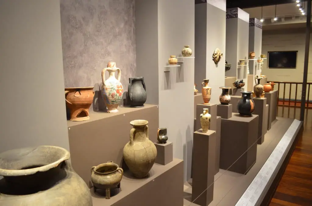 Junto con una serie de figuras, jarrones y otras cerámicas, hay un relieve funerario de mármol que representa la Cena de los Muertos (una comida para el culto de los muertos después de su entierro) que data del siglo IV.