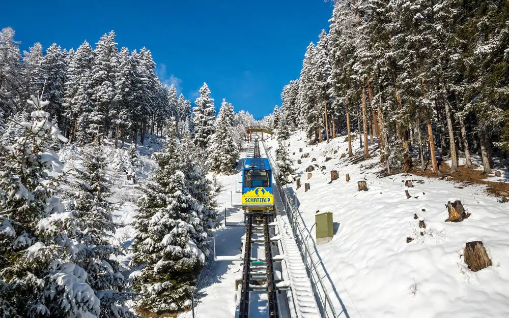 Un ferrocarril de cremallera arriba y abajo de la ladera desde Davos hasta esta área recreativa verde y sin automóviles en las laderas al oeste de la ciudad.