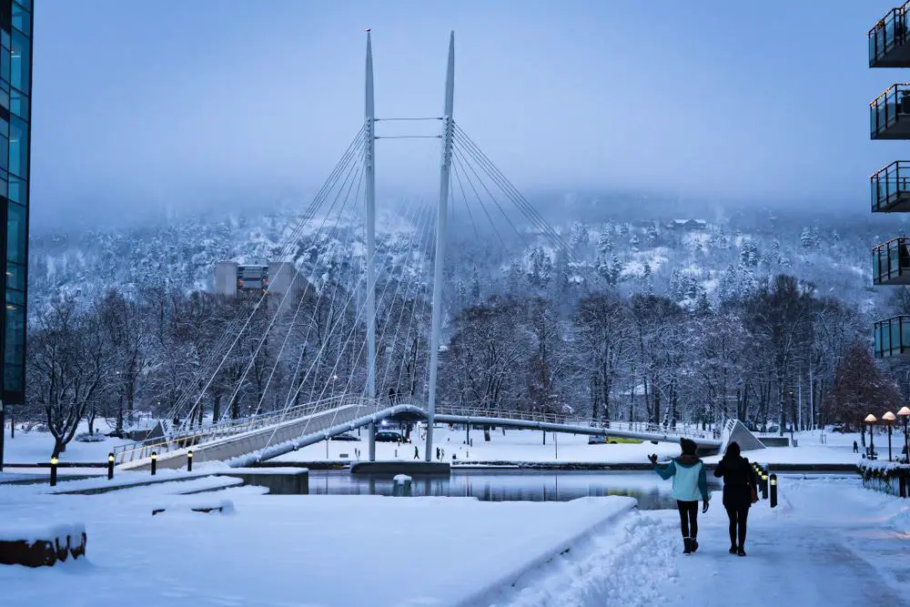 La mayor incorporación reciente al paisaje urbano de Drammen es este cruce peatonal y ciclista atirantado, que se inauguró en 2008 y fue diseñado por la firma de arquitectura Arne Eggen.
