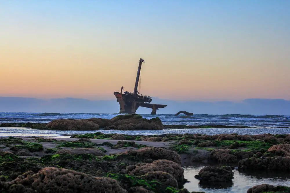 No muy lejos y golpeado por las olas está la proa desintegradora de un barco portacontenedores coreano que encalló en la década de 1980.