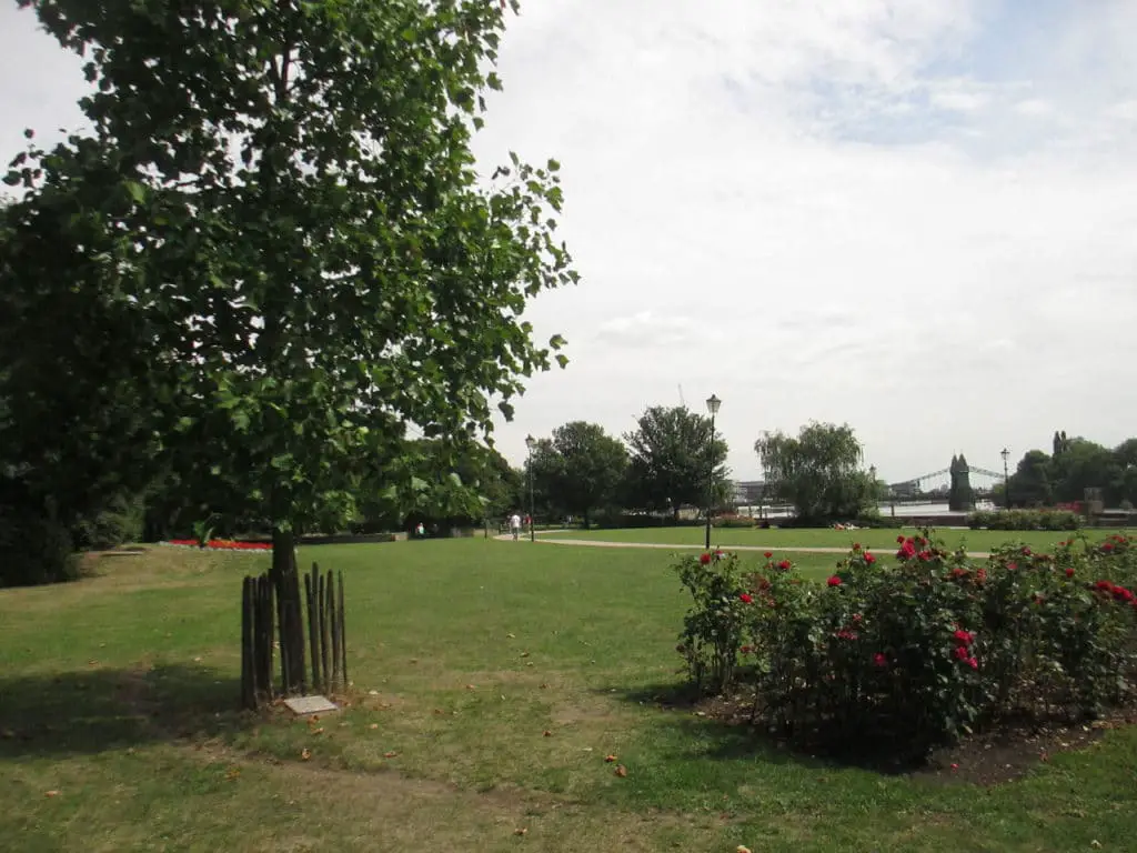 En algún lugar para sentarse y contemplar el puente Hammersmith, los jardines Furnivall se encuentran cerca del vértice del meandro a unos 100 metros río arriba.