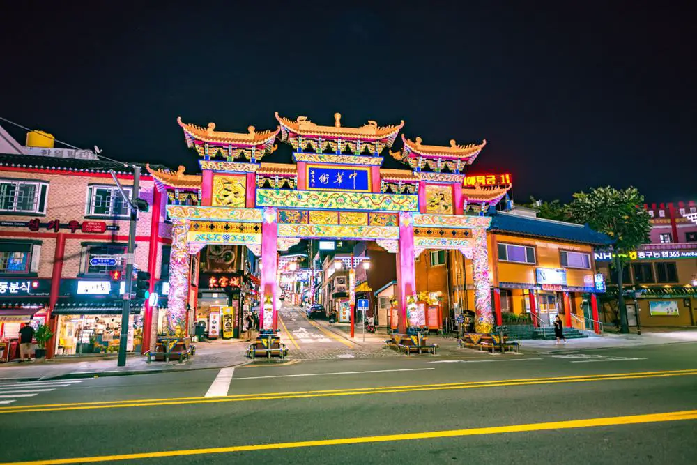 El único barrio chino oficial en Corea está frente a la estación de Incheon en Jung-gu, y existe desde 1884. En estos días, la mayoría de los residentes del barrio chino de Incheon son de segunda o tercera generación, pero todavía hay una población considerable de expatriados chinos en la ciudad, que suman alrededor de 50,000. Chinatown tiene muchas florituras arquitectónicas, las más obvias son los tres paifangs o puertas de enlace.