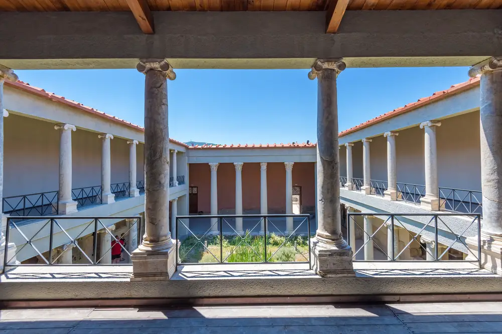 Construida alrededor de dos peristilios con espléndidas columnas y un pequeño atrio, la casa data del siglo II d.C. y se asienta sobre los cimientos de una residencia anterior del periodo helenístico.