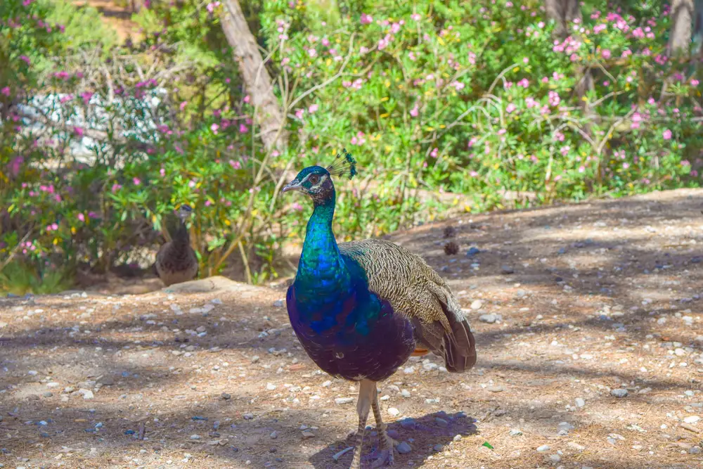 Los pavos reales son las estrellas del espectáculo, especialmente cuando se ve a uno de los coloridos machos luciendo su cola, pero también hay un pequeño estanque, bordeado por arbustos de rododendros con tortugas residentes.