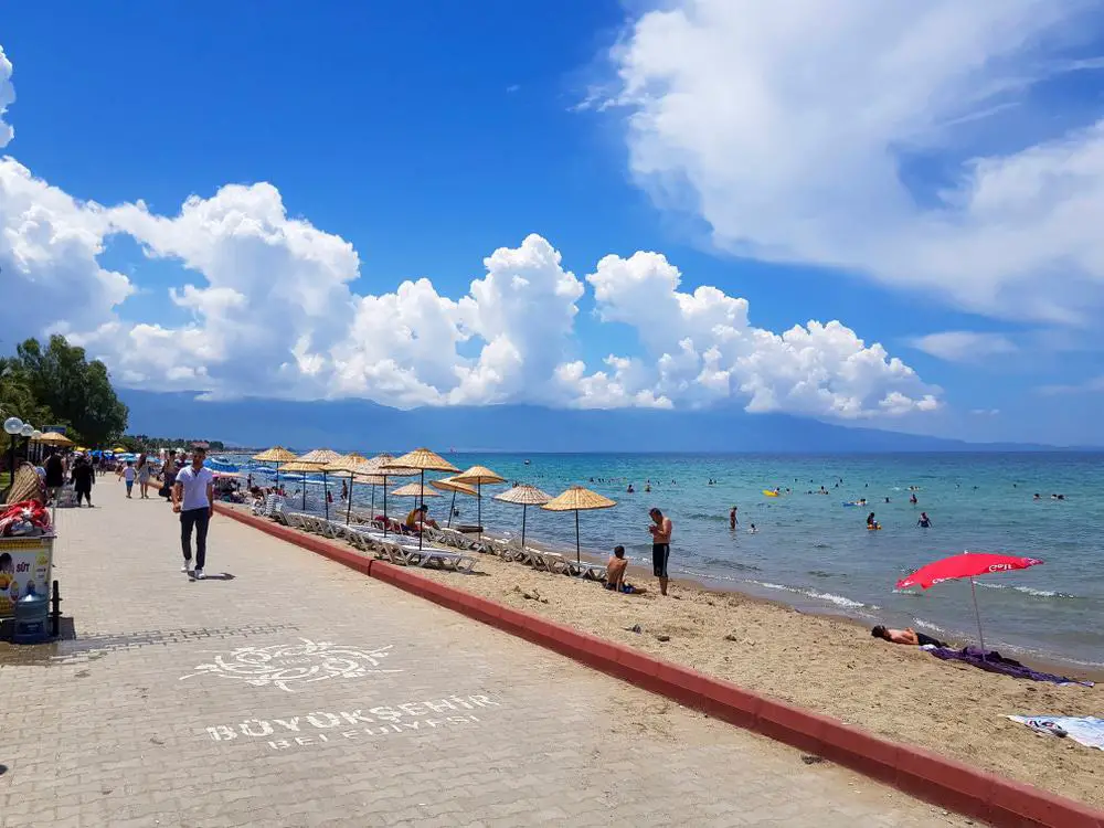 Pamucak Beach es una amplia bahía de arena, de varios kilómetros de largo y permanece tranquila incluso cuando Kuşadası está en su punto más ocupado.